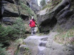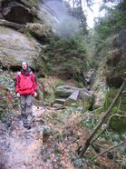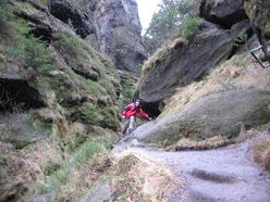 Man läuft erst einen recht ordentlichen Weg talwärts, bevor man etliche Holzstufen nach unten steigt und der Abstecher zum Carolafels abzweigt. Jetzt geht es erstmal nicht so steil weiter und ein meist feuchtes Wegstück folgt nun. Diverse Eisenklammern und Handgriffe säumen nun den weiteren Weg nach unten. Für den geübten Kletterer oder Stiegenerfahrenen sind diese aber kein großes Problem. Es folgen einige Steinstufen, eine Treppe und nochmal Steinstufen, bevor man an der Unteren Affensteinpromenade ankommt.