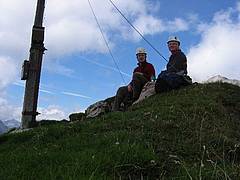 Am nächsten Morgen ging es bei etwas besserem Wetter hoch zur Grünsteinscharte (2.272m), von der wir aus ein Fahrrad auf einem kleinen Gipfel erkennen konnten. Nun ging es auf einem Schotterweg die "Höllreise" hinunter bis zu den ersten Bäumen und dann wieder hinauf zum Stöttltörl (2.036m) - dem Einstieg zum Klettersteig. Die Klettersachen waren schnell angelegt und nun ging es an der Stahlseilsicherung hoch über den schroffen Kamm zur Wankspitze (2.209m). Die super Ausblicke waren ein Genuss. Am Gipfelkreuz gab es dann erst mal eine Stärkung.