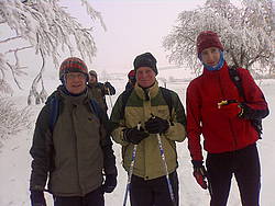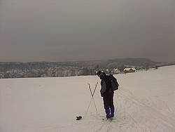 Nach ausgiebiger Stärkung mit Nudeln, Suppe und dem einen oder anderen böhmischen Getränk zogen wir weiter Richtung Großer Schneeberg. Den ließen wir aber rechts liegen, aber auch die Umfahrung hielt einige rasanten Abfahrten bereit. Einmal war der Weg so steil, dass wir die Ski sogar tragen mussten. Der weitere Weg Richtung Maxdorf zog sich dann doch arg in die Länge, Arme und Beine wurden langsam schwer. Doch die nahende Dunkelheit und der gut geschossene Tee setzten die letzten Kräfte frei und so erreichten wir praktisch mit Einbruch der Dunkelheit Reinhartsdorf-Schöna mit einem sehr schönen Ausblick auf Zirkelstein und Winterberg. Im Zug nach Hause trafen wir dann auch die Mehrheit der anderen Skifahrer wieder, diesmal weniger beengt als bei der Anreise.